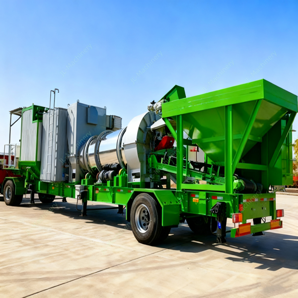 主要结构组成 一台典型的移动滚筒式沥青搅拌设备通常包含以下几个关键系统: 冷料供给系统: 组成部分: 冷料仓、给料机、集料皮带机。 功能: 储存不同规格的砂、石等骨料,并按预设比例将骨料输送至干燥滚筒。 干燥搅拌滚筒(核心部件): 结构: 一个倾斜安装、可正反转的长形滚筒,内部装有不同形式的叶片。 功能: 这是它与间歇式设备最根本的区别。骨料在这里完成以下所有工序: 烘干与加热: 滚筒前端通入高温烟气,骨料在滚筒内被翻滚、提升,与热气流充分接触,去除水分并加热到设定温度(通常160-180°C)。 拌和: 在滚筒的中后部,加热后的骨料与按比例计量的沥青、矿物粉(填料)一同被投入,在滚筒的继续旋转和叶片的作用下,被充分、均匀地搅拌成合格的沥青混合料。 燃烧系统: 组成部分: 燃烧器、燃油(或燃气)供应系统、鼓风机。 功能: 产生高温、稳定的火焰和热烟气,为干燥滚筒提供热源。 沥青供给系统: 组成部分: 沥青保温罐、沥青泵、计量装置。 功能: 将液态沥青加热并保温,然后精确地泵送到干燥搅拌滚筒中。 粉料供给系统: 组成部分: 粉料仓、螺旋输送机、计量装置。 功能: 储存和精确添加矿物粉(填料),以改善沥青混合料的性能。 除尘系统: 组成部分: 重力除尘器、布袋除尘器(主流)、引风机。 功能: 收集干燥和搅拌过程中产生的粉尘,确保排放达标,保护环境。 控制系统: 功能: 通常采用PLC(可编程逻辑控制器)和工控机,实现对整个生产过程的自动化控制、配方管理、数据记录和故障诊断。操作员在控制室内即可完成全部操作。 移动底盘: 功能: 将上述所有系统模块集成在重型拖挂车桥上,具备灯光、刹车系统,符合公路运输法规,方便转场。